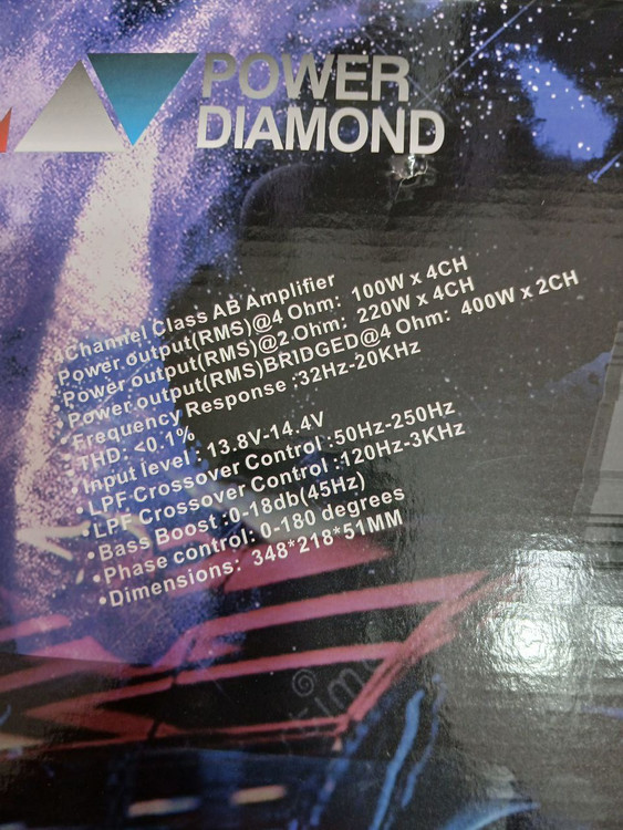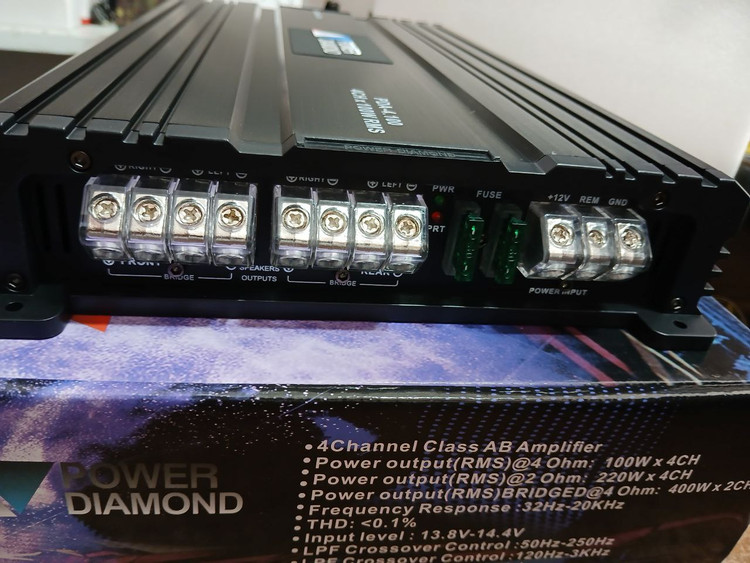 آمپلی فایر پاور دیاموند 100.4 دارای اعوجاج نویز هارمونیک کمتر از 1 درصد می باشد. همچنین ورودی سطح بلندگوی این دستگاه هم معادل 13.8V-14.4V است.